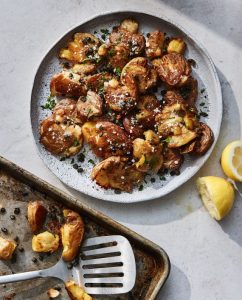 These smashed potatoes hold a very special place in my heart. They possess all of the best qualities a good potato recipe should have—a crisp french fry–like exterior with a creamy mashed potato–like interior. Throw in a few crisp, salty capers and you have the ultimate crowd-pleasing side dish.